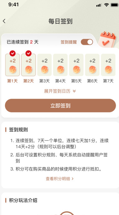 3、支持签到、完成指定任务等额外积分获取方式,丰富积分积累渠道。