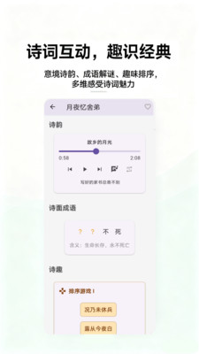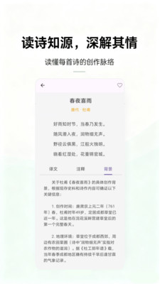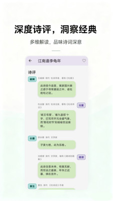 2、深度读诗模块精准赋能,逐句拆解诗词内涵,结合意象与手法分析,打破鉴赏壁垒,让用户能读懂诗中真意。