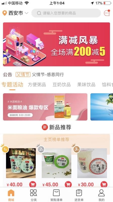 2、来到软件分类页面,可查看果味饮料、豆奶新品、方便粥品、米面粮油等内容。