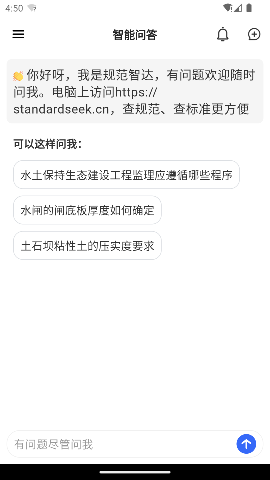 规范智达app是专门为工程行业打造的一个线上智能问答平台,可以帮助广大从业者轻松解决工作中遇到的难题,只需要在提问框编辑自己的问题,平台会快速的进行解答,并且是用专业术语,可以很好的去规范行业行为,有什么最新的行业规定都会及时的更新,更好的去顺应时代的要求。