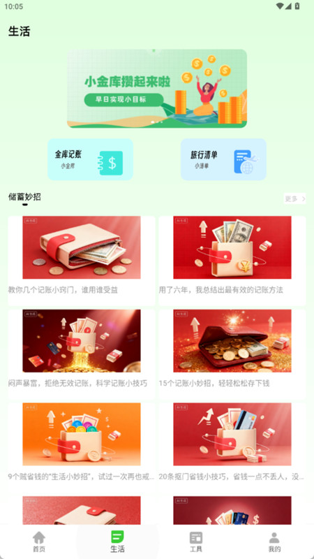 3、在生活页面,包含金库记账、旅行清单等生活管理板块,并分享储蓄妙招。