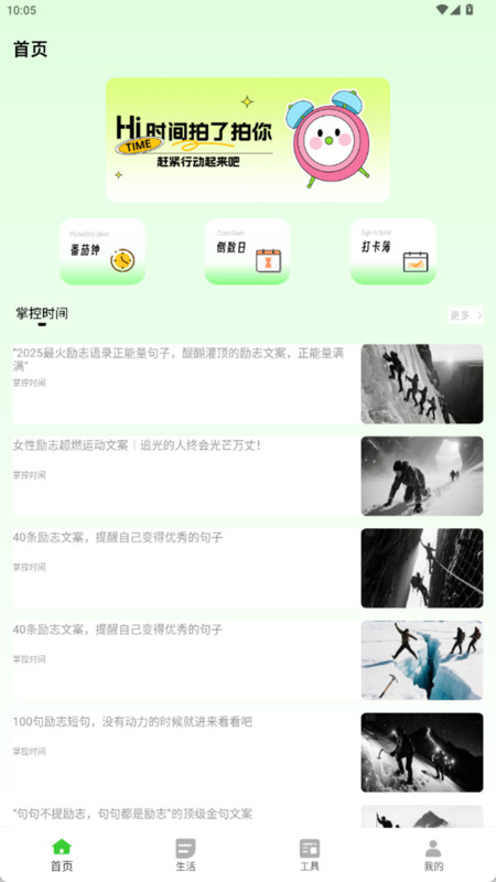 1、首页核心提供番茄钟、倒数日、打卡本等时间管理功能,帮助你掌控时间。