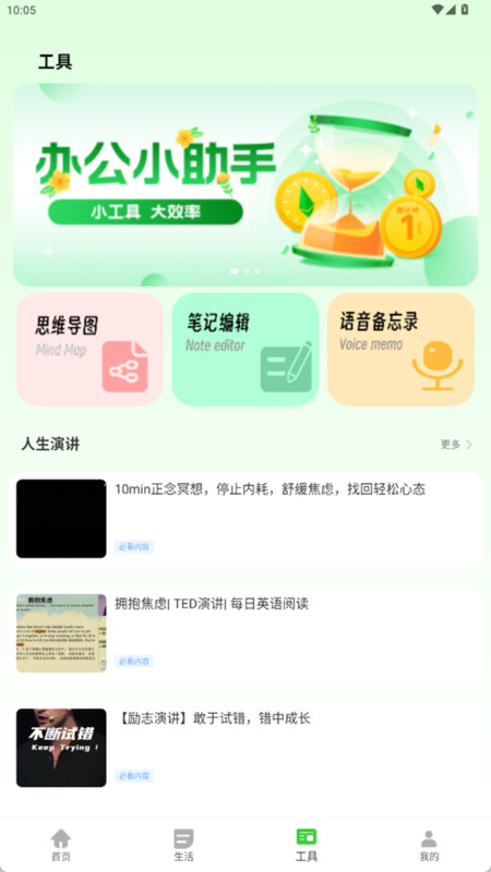 4、工具页面提供思维导图、笔记编辑、语音备忘录及人生演讲等创作与记录工具。