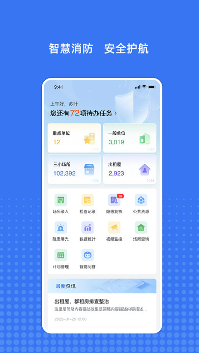 3、进入首页,可随时查看最新资讯,还可进行场所查询、隐患上报等操作。