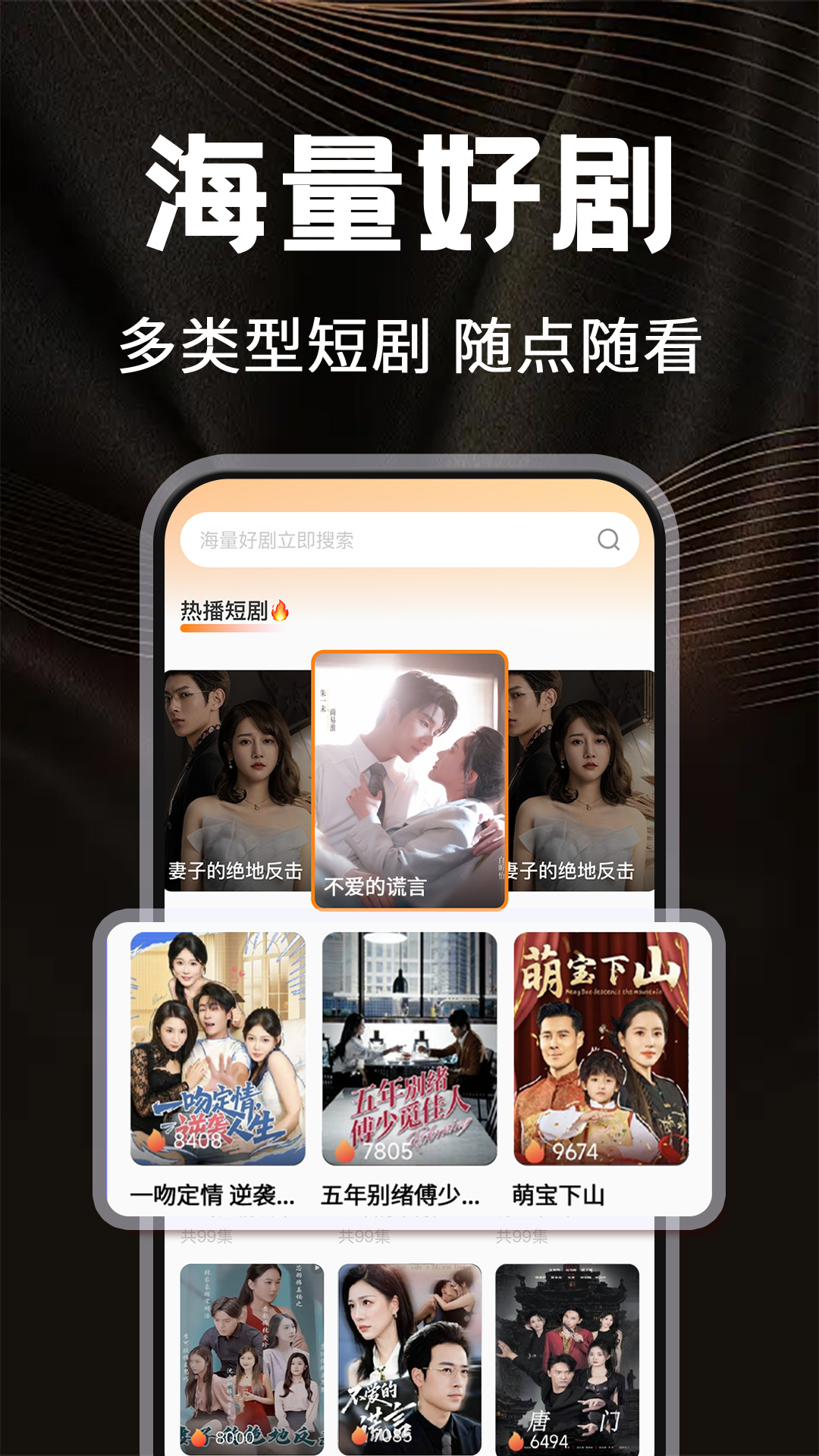 1、 用户可按题材(如都市、古装、悬疑)或热度浏览海量短剧,也可以通过关键词搜索特定剧集。