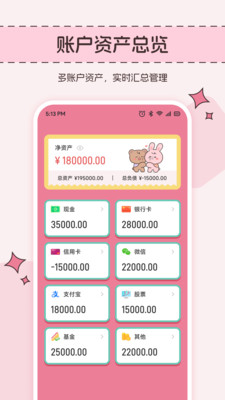 2、账户资产总览可视化呈现,整合银行卡、微信、支付宝等多账户余额,实时掌握资产状况,财务全局尽在掌控。