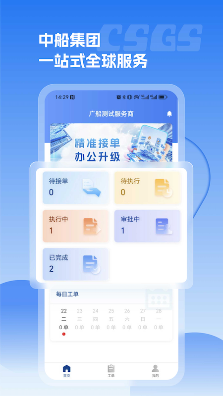 CSGS app下载是一款专为已通过认证的中船全球服务网络平台工程师设计的移动端工单管理软件。它旨在为工程师提供高效、便捷的线上作业支持,实现对维修服务工单的全流程数字化操作。应用首页集中展示核心工作概览,包括各状态工单统计、每日工单统计及消息提醒。工程师可点击统计模块进入对应状态的工单列表,并支持按时间、维修项、派单单位等多字段进行筛选。