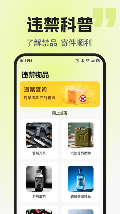 1、 提供分类清晰的违禁物品知识库,帮助用户在寄件前自查,有效避免包裹被退回。