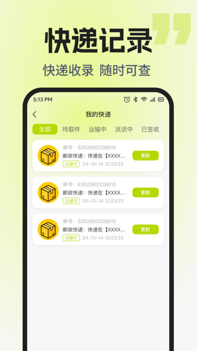 2、 可按物流节点将包裹归类为待取件、派送中等状态,实现快递信息的清晰化管理。