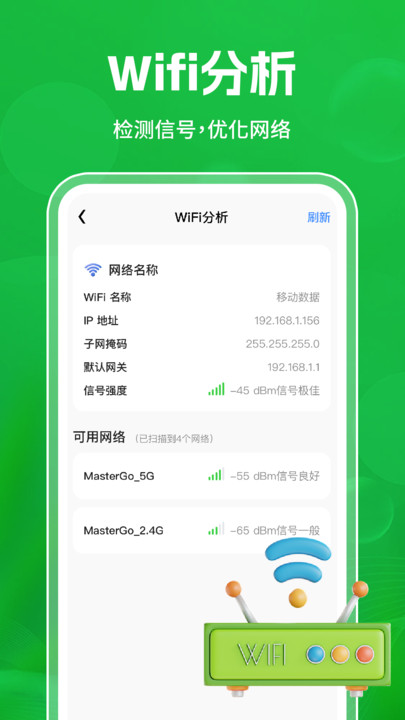 3、以雷达图形式展示周边热点信号强弱与距离,用户可直观选择最佳网络,避免连接到弱信号热点导致频繁掉线,提升上网稳定性。