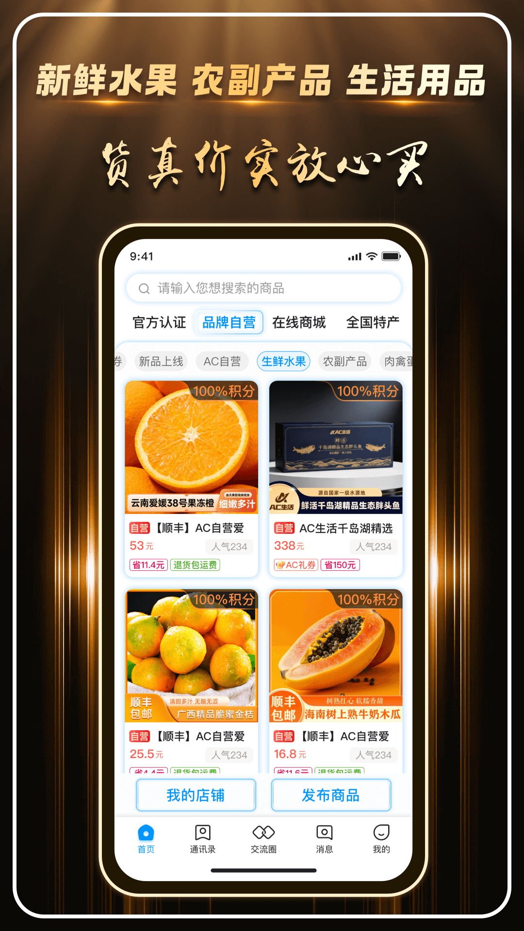 AC生活极速版app下载是一款定位高端的自营式电商购物平台软件,主营高品质生鲜水果、优质农产品、地方特色土特产以及精选的日常生活用品。平台从创立之初便构建了从源头到配送的完整自营体系,通过自建物流网络和仓储基地,并对所有商品执行严格的质检流程,确保送达用户手中的每一件商品都品质卓越、健康安全,并承诺提供包退包换的可靠售后。