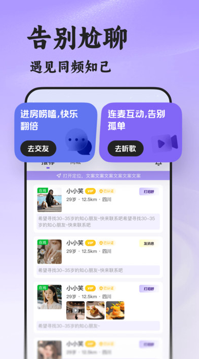 1、用户可快速与附近异性发起实时互动,互动形式灵活多样,支持多场景交流切换。