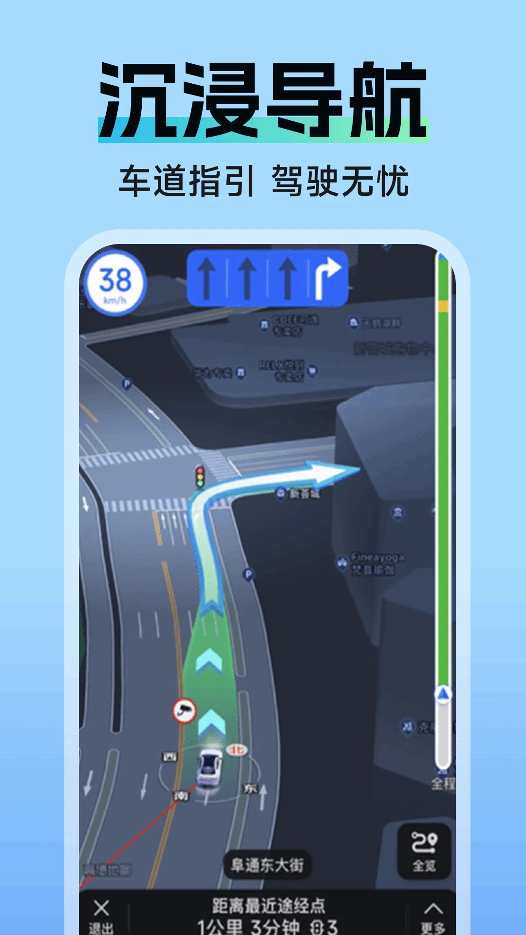 2、采用沉浸式立体导航技术,真实还原道路场景,清晰展示行驶轨迹,并实时提示车速与距离信息。