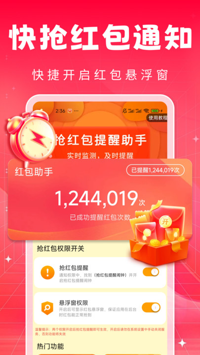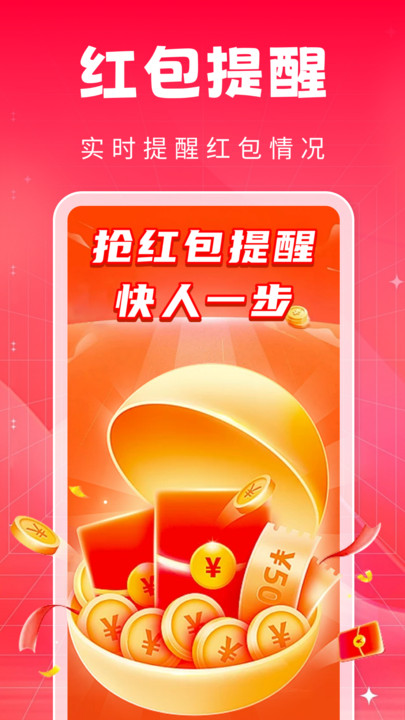 1、 通过即时、精准的提醒,使用户能先人一步发现并点击红包,极大增加抢到红包的几率。
