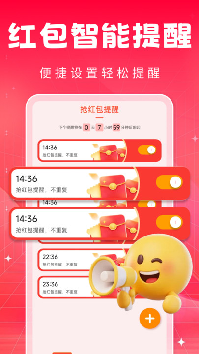 抢红包提醒闹钟app下载是一款专门为提升用户在社交媒体上抢红包成功率而设计的智能提醒工具软件。它通过精准的实时监测与提醒机制,确保您不错过任何红包机会。当您关注的社交应用(如微信、QQ)出现红包消息时,软件会立即触发声音、震动及屏幕弹窗提醒,让您能第一时间响应。