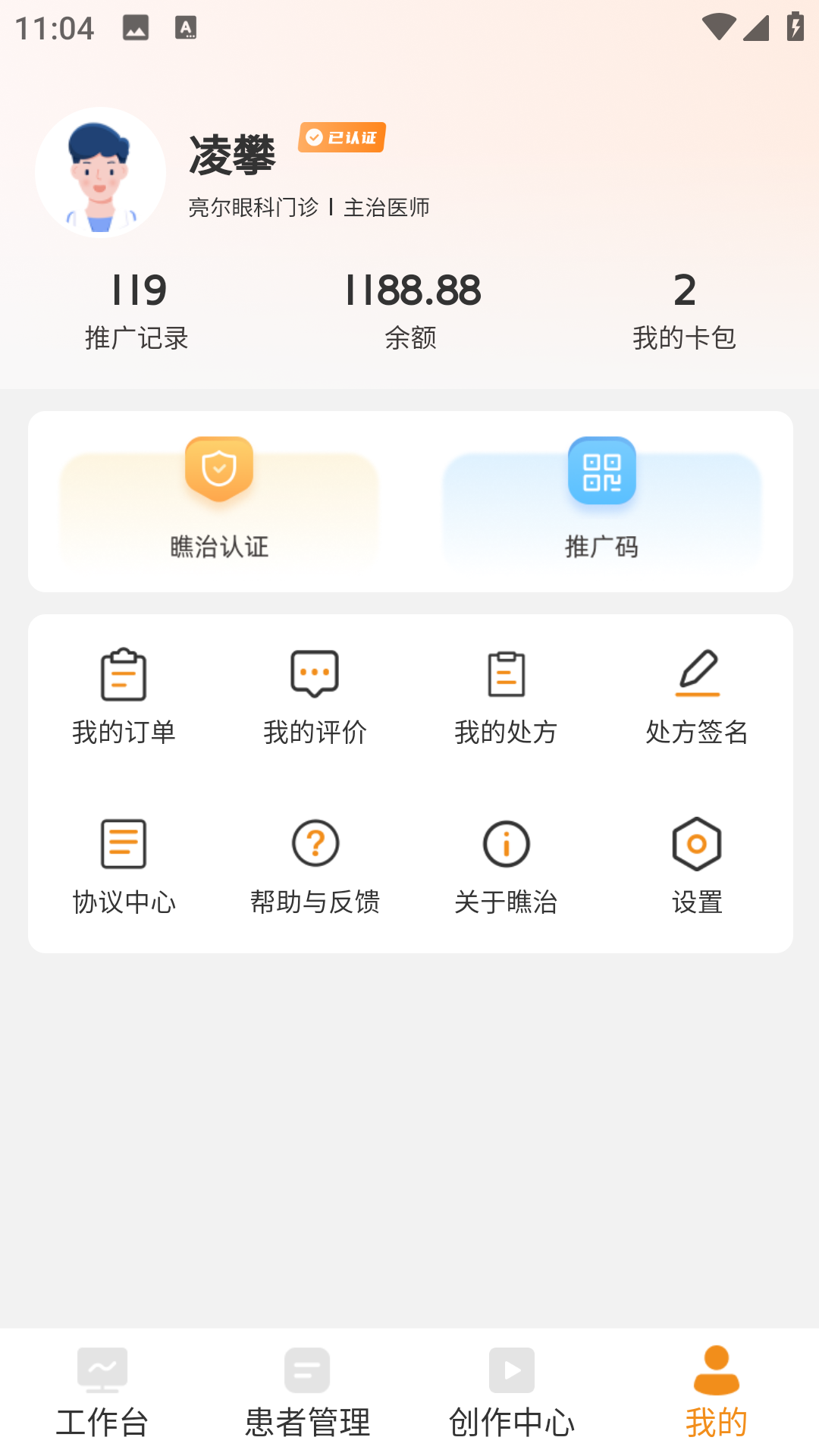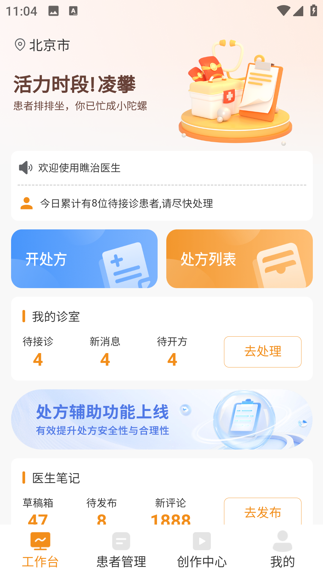 3、打开app进入首页中,就能看到工作台使用、患者管理使用、创作中心模块可供操作使用。