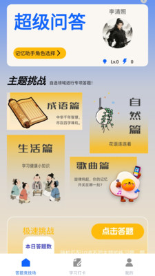 超级问答app是一款创新在线答题应用,集知识探索与趣味挑战于一体,让每一次指尖的滑动,都成为开启智慧宝藏、收获无限乐趣的神奇之旅,你可以挑选一位贴心的记忆助手,与你并肩作战,在主题挑战的广阔舞台上,深入挖掘成语的深邃、自然的奥秘、人文的璀璨、歌曲的旋律,让知识的海洋因你而波澜壮阔。