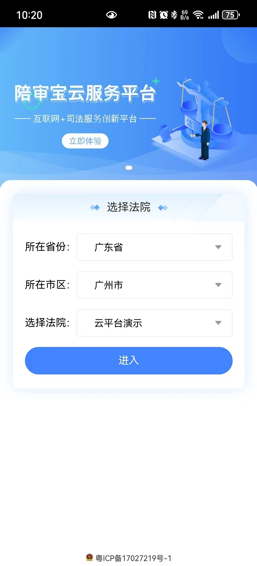 2、选择所在省份、所在市区和对应的法院,点击进入正式进入平台中。