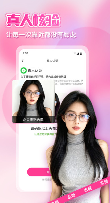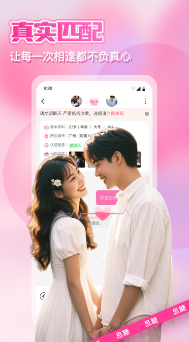 思糖app是一款很不错的真人高效在线配对交友软件,在这交友必须要实名制,只有平台认证通过了那么用户才可以获得交友机会,才可以随时来这挑选你喜欢的异性,支持和异性进行面对面在线聊,聊的还不错的话也是可以随时组织线下见面,让你轻松发现你的爱情,快速来这表白,快速开启你的新生活,拒绝等待在线交友。