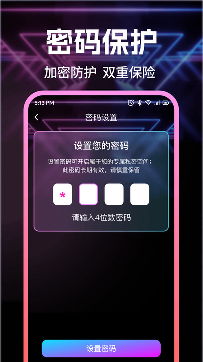 2、用户可设定专属的数字密码、图案密码或生物识别(如指纹),作为进入应用的唯一凭证。