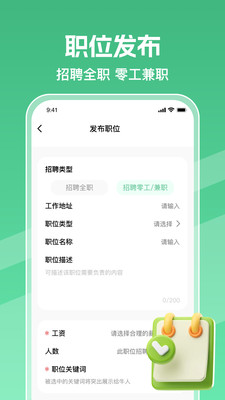 2、职位发布流程极简,填写工作内容、薪资标准、地点时间即可上架,智能审核快速通过,招人更高效。