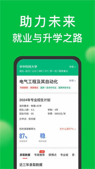 录取概率评测、志愿风险评估、能上的学校、能上的专业、专业数据对比等超级实用功能,助你快速锁定大学和专业。
