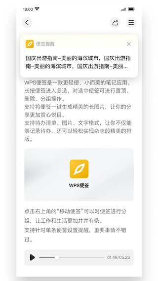 《WPS便签》是一款十分好用和深受上班族喜爱的商业办公智能笔记和便签手机软件,为用户提供了独特的使用体验,专业和强大的功能设置,让用户随时随地打开软件就可记录内容,且搭配简洁的界面和流畅的操作,高度提升了工作的效率,同时还设有了日程提醒和分组管理的功能,在进行开会时可以快速写下和记录所有开会的终点,同时也可在日常生活中随时打开软件就可以记录各种重要的事情,内容也将会自动同步到各种不同的电子设备,即使其中一个设备丢失的话,内容也将会在其他设备里。