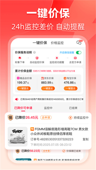 24小时自动帮你监控购买的商品是否降价,一旦出现降价,粉象立马提醒您申请价保,差价立即到账。用粉象一键价保,放心购物,你的专属省钱助手。