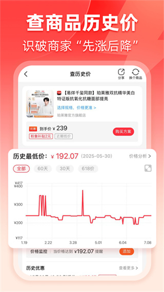 购物先查历史价格,轻松识别商家虚假促销!大促期间商家喜欢“先涨后降”,查历史价立马识别套路。选择合适时机购买,粉象帮你避坑~