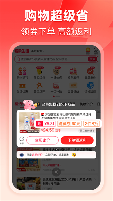 粉象支持淘宝、京东、拼多多、唯品会、抖音等各大电商平台购物返现,返利高返现快!另外还有粉象独家补贴和隐藏优惠券,比直接买省多了!