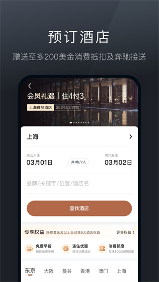 1、会员预订酒店可享免费双人早餐、房型升级、100美金消费额度等专属礼遇;
