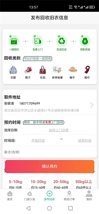 打开《聚换旧衣服回收》APP,新用户需注册账号并绑定个人信息。在首页,选择预约回收,填写取件地址、预约时间及联系方式,选择回收品类,如有旧衣、书籍、塑料等,确认订单后等待快递上门取件即可。