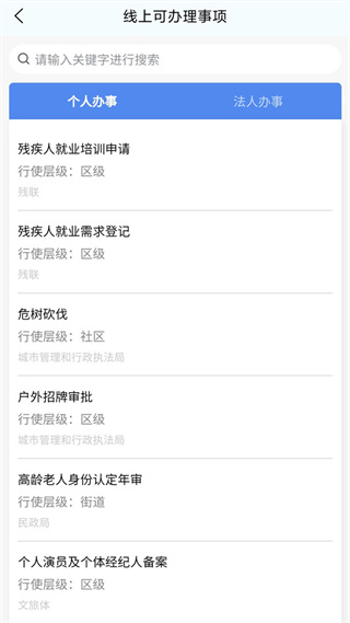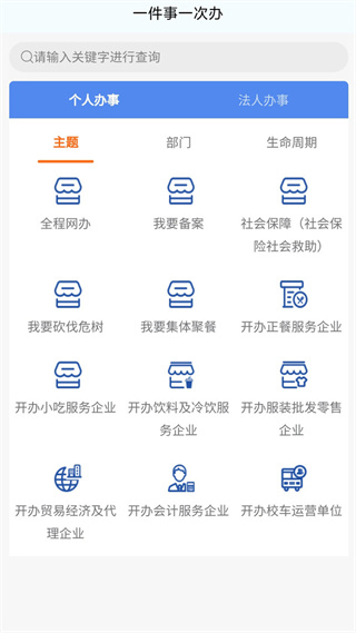 我的政务,实现“一件事一次办”,在办事板块中按高频办事项以及部门查询各类行政审批和公共服务事项的办事指南。