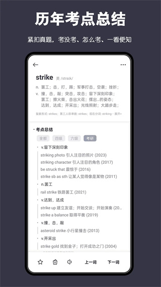 1、30余类考试词汇库,包括了高考、考研、四六级、专四专八、雅思、托福、GRE等;