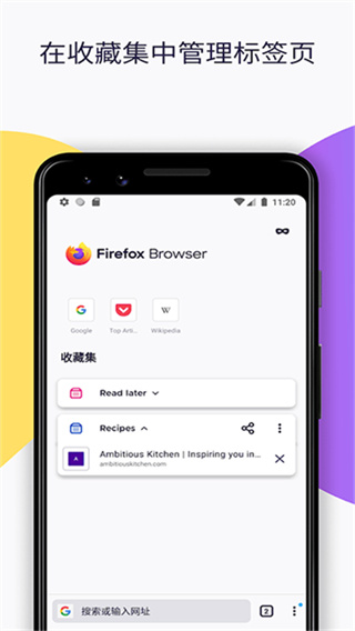 所有打开的标签页智能分组,书签到位、常用网站和热门内容一并呈现。打开Firefox,即刻回到上次浏览进度。