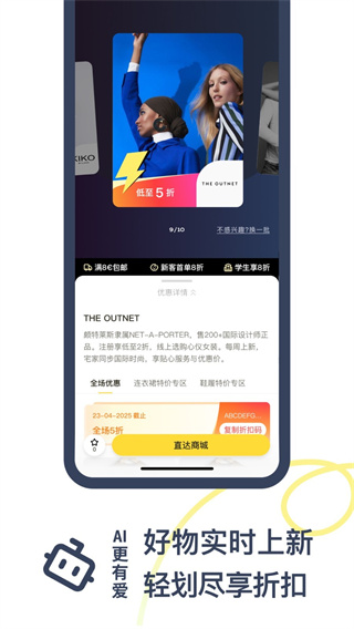 打开APP,在首页顶部可以切换所在国家站点,通过搜索栏查找特定商品或品牌,浏览折扣feed流发现优惠。点击感兴趣的商品然后进入详情页,用户可以查看到品牌信息、折扣介绍、使用条款及跳转链接,点击直达电商官网即可完成下单。