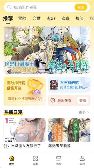 1、首页将会展示推荐内容以及不同题材的漫画分类,顶部还有搜索栏可以让用户直接输入漫画名或者作者名就能进行查找,也可以在推荐或排行榜中找到近期的热门作品。