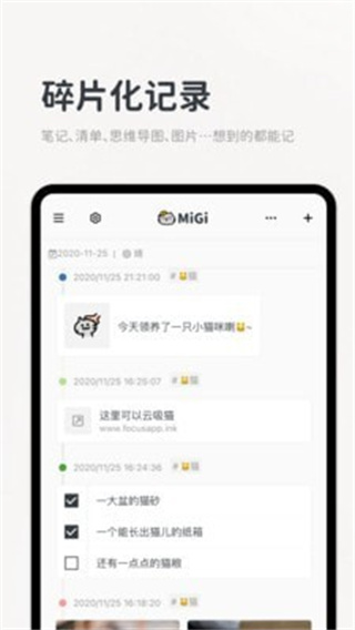 《Migi》是一款跨平台时间轴记事APP,它以时间轴为核心,提供记录文本、笔记、图片、清单、心情、附件等十余种内容类型,同时采用了记录与整理解耦的设计理念,让用户专注记录当下,后期通过标签、日期、类型二次归档,轻松管理碎片化生活信息。