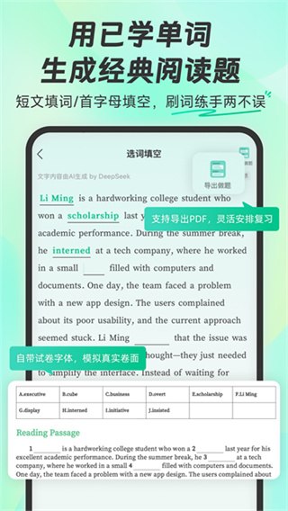 ·短文填词:基于已学词汇,自动生成首字母填空、选词填空等高频考试题型,背词与刷题同步完成