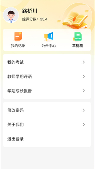 4、在个人中心页面中可以查看自己的综评分数同时可以进入我的记录、草稿箱和账号管理等功能对个人信息和记录进行管理。