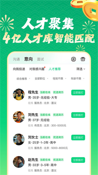 4、除了找工作还可以进行招聘人才,查看求职者的简历了解对方的工作经验、既能情况和基本资料等。