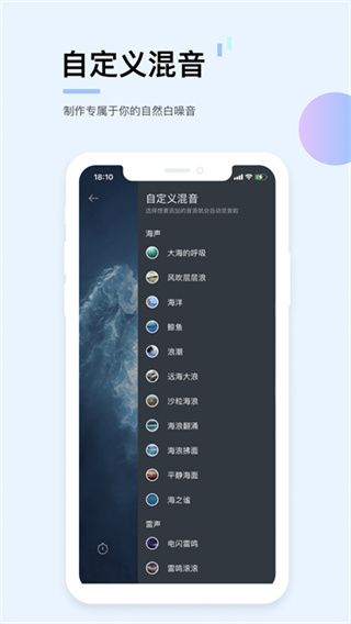 1、可以选择多种不同类型的环境声音,比如下雨、森林或是海边登上声音让自己在听久后慢慢放松下来;