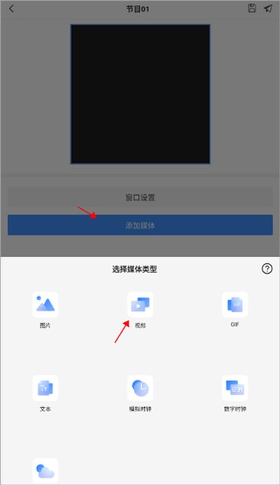 2.创建好新的节目之后,在节目编辑界面里,点击“添加媒体”按钮,在弹出的选项中选择“视频”,这样你就可以从手机相册里选择想要播放的视频文件添加进来了。