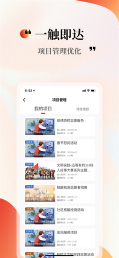 3、贴心的项目管理,你参与过的所有志愿者项目都帮你整理得妥妥当当,服务时间自动登记,考勤和退出操作也都超级方便。