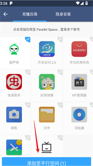 2、在列表中选择需要加入的应用点击添加至平行空间app里。