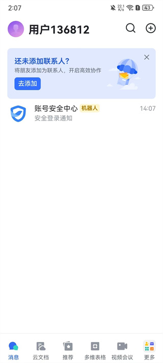 3、随后选择对应的方式完成登录后就可以进入首页中开始使用各类的办公工具,比如聊天、文档以及日程管理等等。