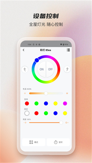 1、灯具的开关、亮度和颜色等都可以在手机里直接进行调节,想更换家里的光线氛围点击软件就可以轻松搞定;