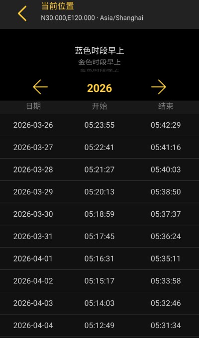 实时计算日出日落月出月落时间,同步呈现摄影黄金时刻暮曙光与太阳月球实时位置信息。