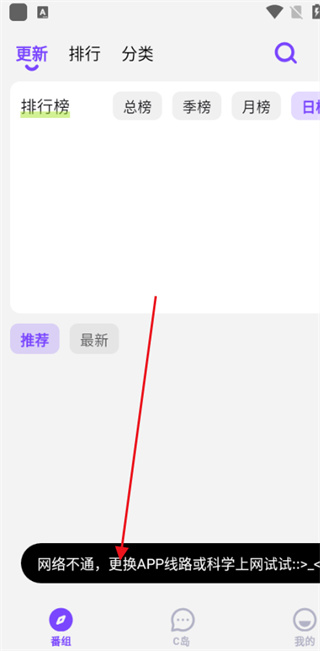 1、当打开clicli动漫后显示“网络不通,更换app路线或科学上网试试”就说明当前路线不可使用。