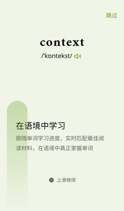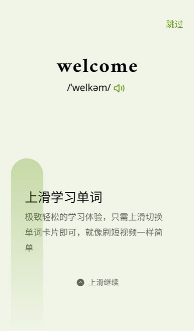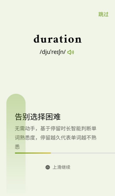 沿用短视频浏览逻辑,上滑切换单词卡片。系统依托停留时长判定掌握程度,省去人工划分词汇等级的步骤,操作流畅省心。